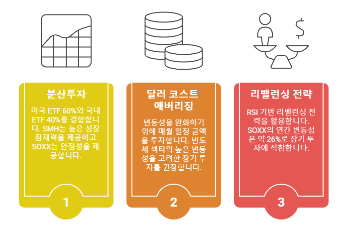 - 안정적 포트폴리오: SOXX 40% + SMH 30% + 국내 반도체 ETF 30%